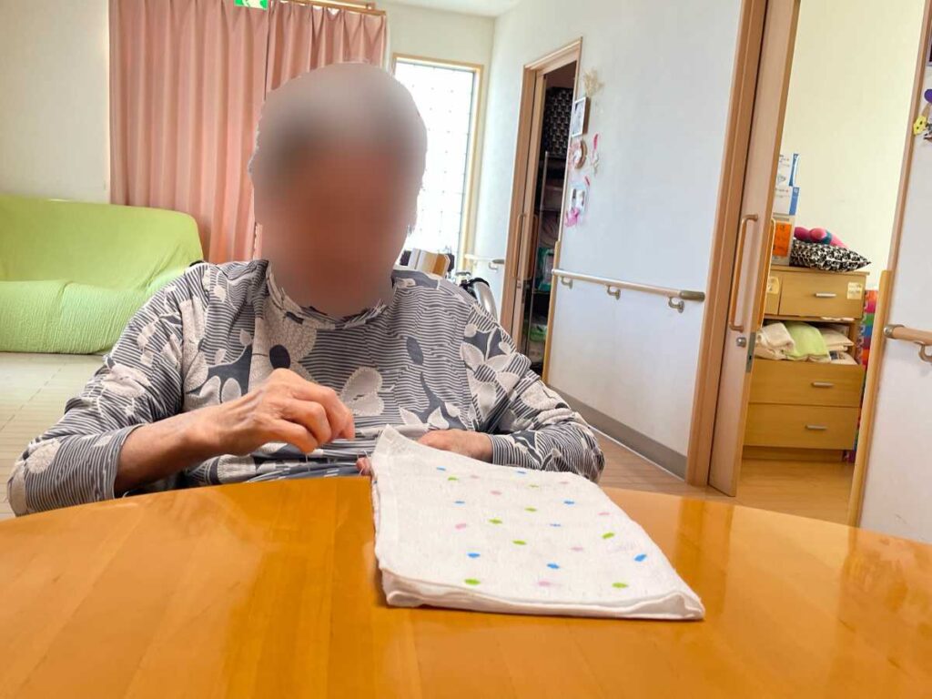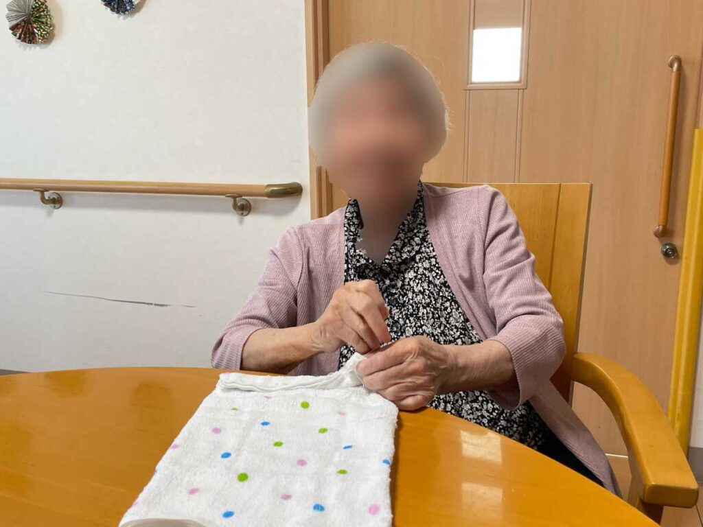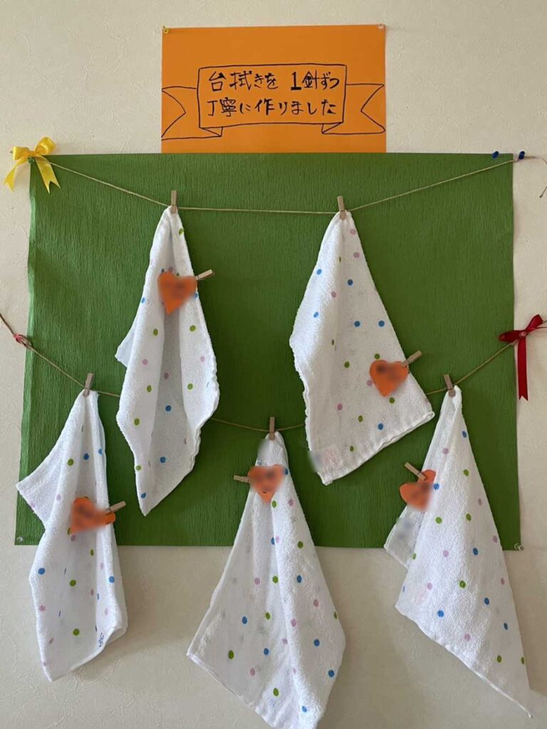 布巾を作りました 2025 10/10 日常の様子 2025年10月10日 先日、グループホームあすなろでは台拭きを作りました。皆さんひと針ひと針を丁寧に作業されていました。 完成した布巾は壁に飾りました! 日常の様子 秋の味覚を収穫しました